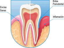 La enfermedad periodontal, comúnmente conocida como piorrea, es una proceso imflmatorio que se produce cuando las bacterias que habitan en la boca se depositan sobre la superficie de los dientes en forma de placa y sarro, haciendo que se vaya perdiendo el hueso que sujeta los dientes y provocando a largo plazo la caída de los mismos.